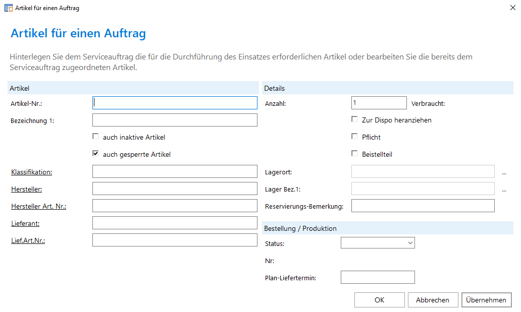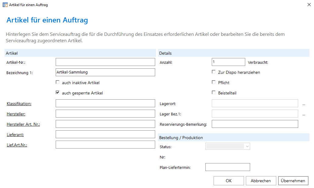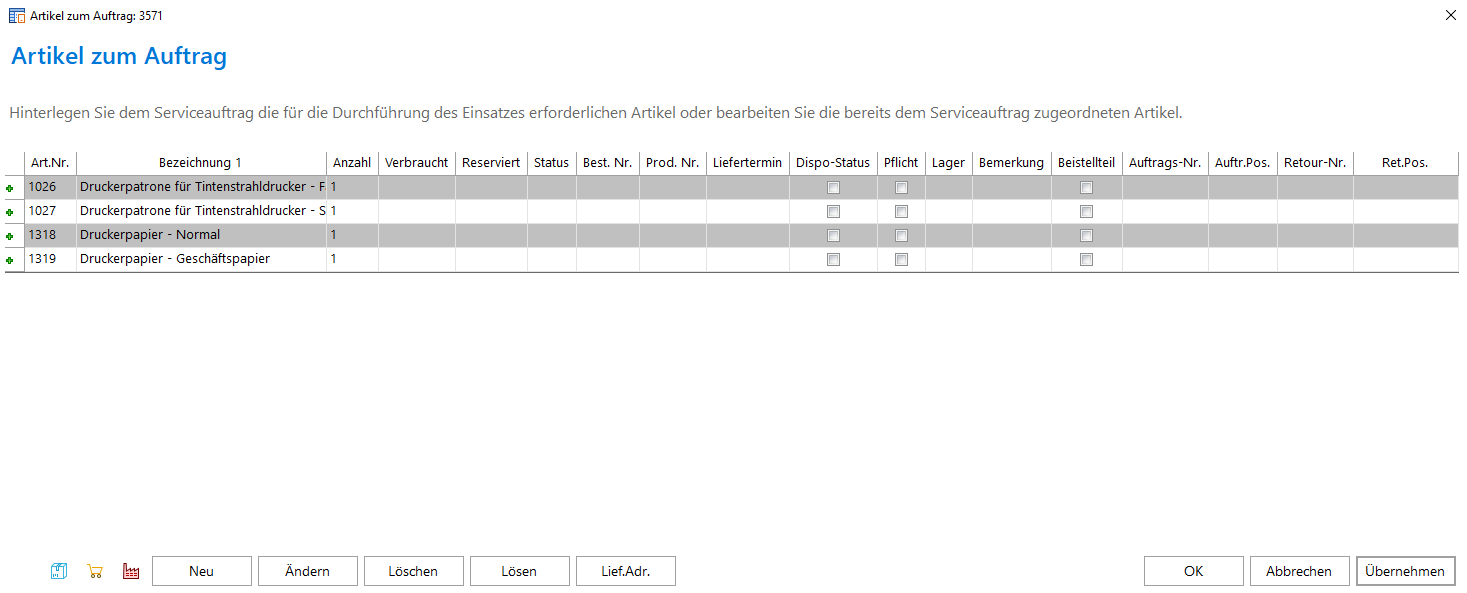 Sofern es notwendig ist, können einem Service-Auftrag schon im Vorfeld Artikel zugeordnet werden, die für die Durchführung des Einsatzes erforderlich sind.