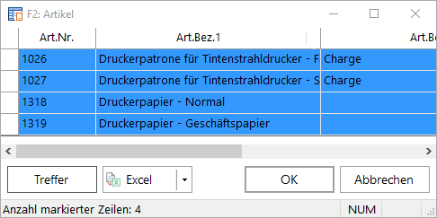 Bei der Auswahl der Artikel zu einem Auftrag können auch mehrere Artikel markiert und mit OK übernommen werden.