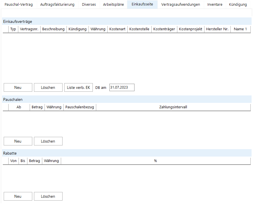 Auf diesem Reiter im Vertragsdialog findet die Anlage, Änderung und das Entfernen von Einträgen statt, welche die Kostenseite eines Vertrags abbilden. So ist es möglich, für eine optimierte Vertragskalkulation und Auswertungen detailliertere Daten einem verkaufsseitigen Vertrag gegenüber zu stellen. Die Einkaufsseite umfasst neben Einkaufsverträgen ebenfalls Änderungen der Pauschalen, sowie prozentuale oder absolute Rabatte.