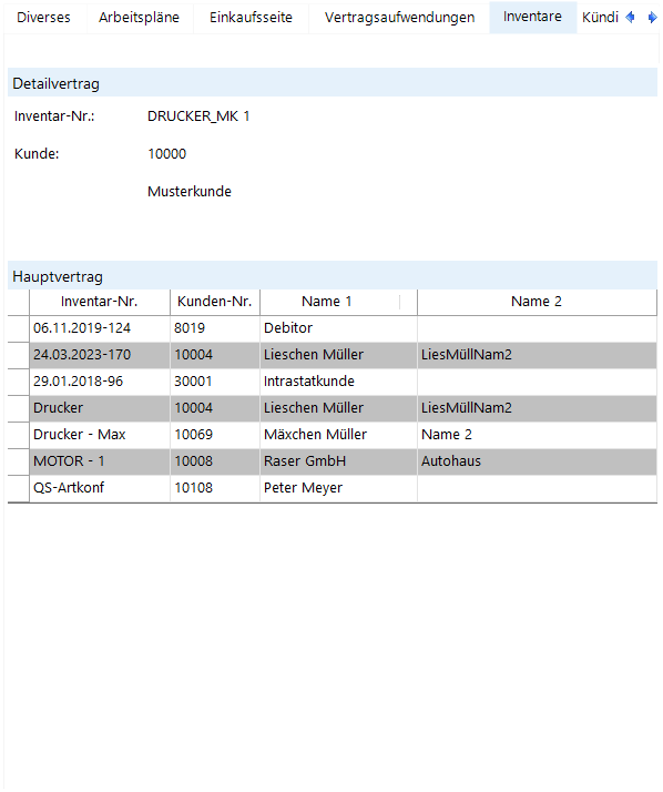 In der Feldgruppe "Detailvertrag" finden Sie die folgenden Informationen zum Inventar und Kunden, denen der Vertrag als "Detailvertrag" zugeordnet wurde: