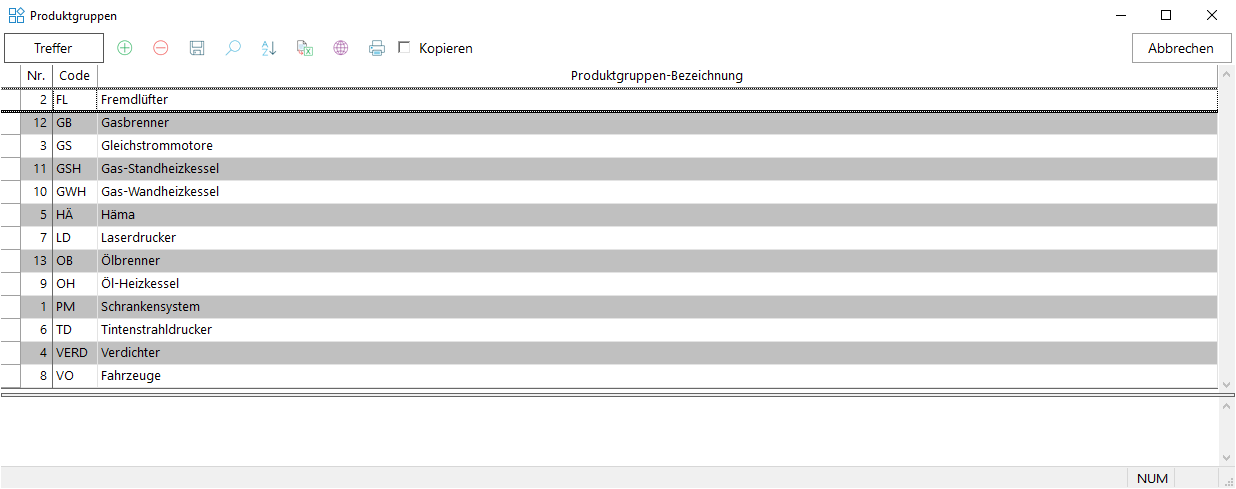 Das Feld Code enthält das Kürzel der Produktgruppe, welches in der Applikation hauptsächlich verwendet wird. Dieser Code kann aus bis zu fünf alphanumerischen Zeichen bestehen.