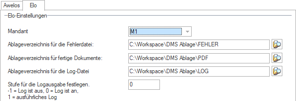 - Die LOG-Dateien für den Export von ELO-Dokumenten aus eEvolution heraus, die die Aktionen und Fehler beim Export von Dokumenten aus eEvolution protokollieren. Diese LOG-Dateien werden pro Datenbank und Mandant in der Systemkonfiguration auf dem Reiter "DMS - ELO" hinterlegt.