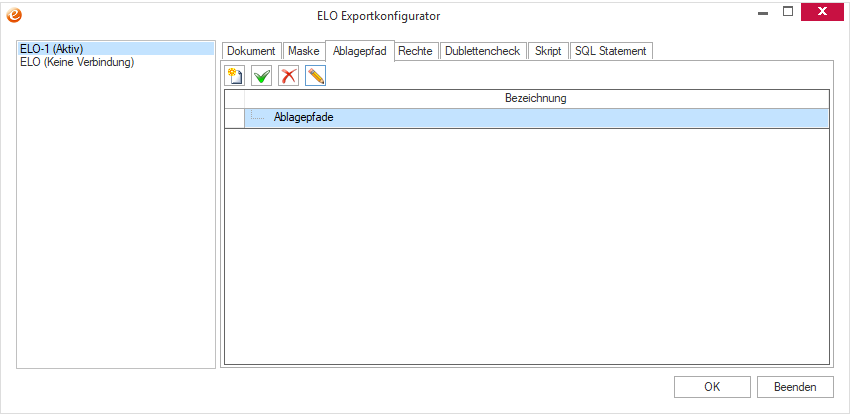 Hier kann der Ablagepfad bzw. die Referenzen für ELO in einem Baum konfiguriert werde. Der erste Pfad der angelegt wird ist dabei immer die Hauptreferenz, alle weiteren sind Nebenreferenzen. Eine Ablageebene kann sich aus mehreren Elementen zusammensetzen, wobei ein Element ein Freitext oder ein Schlüsselwort aus den Exportmoduldaten sein kann.