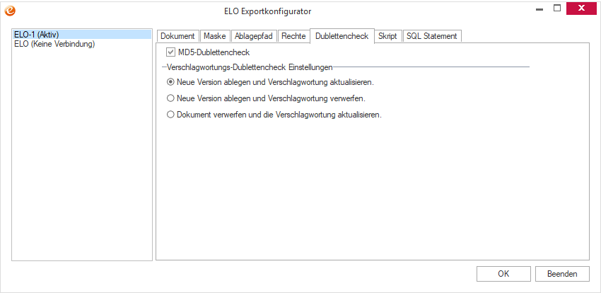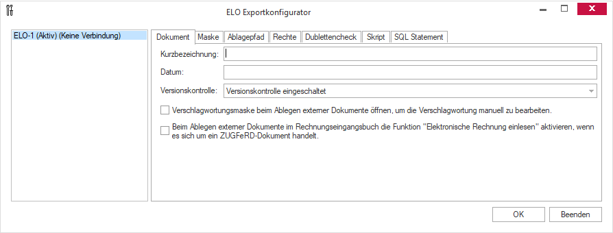 Diese Option kann nur beim Exportdokument "Externes ELO Dokument | 1.0" aktiviert werden und ist in allen anderen Fällen nicht verfügbar.