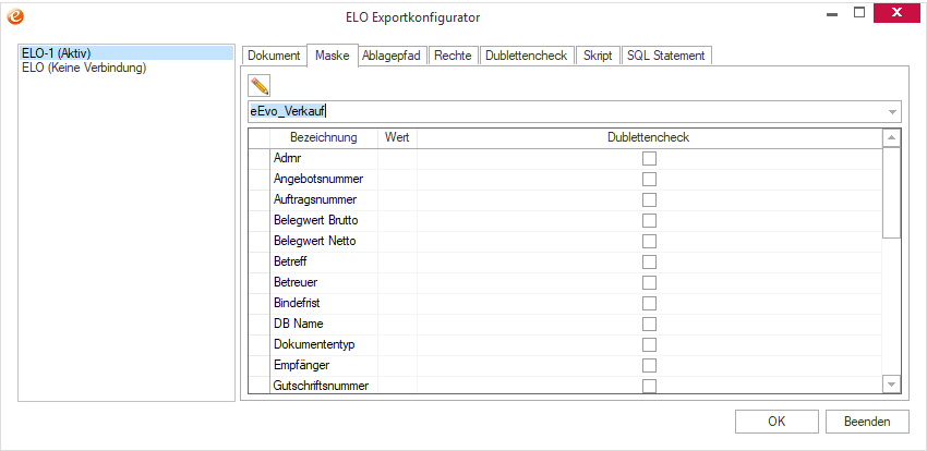 Auf dem Reiter "Maske" kann ein Benutzer die gewünschte ELO Maske auswählen, um dort den einzelnen Indexzeilen Werte zuordnen und festzulegen, ob diese Indexzeile für den Dublettencheck verwendet wird.