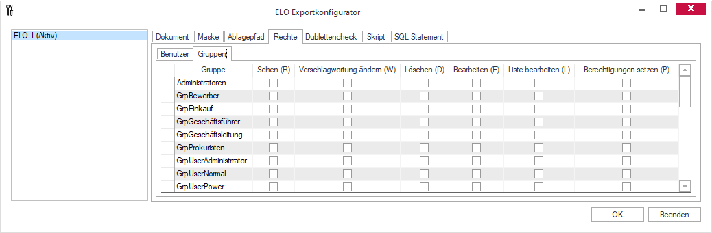 Hier können die Rechte für die Dokumente an die ELO Benutzer und ELO Gruppen eingesehen und angepasst werden. Auf dem Reiter "Benutzer" befinden sich die Rechte der einzelnen Benutzer, auf dem Reiter "Gruppen" die Rechte der einzelnen Gruppen.