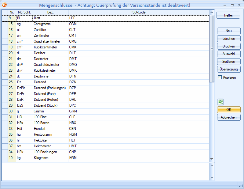 Im Inst-Modul können über ein Skript (add_iso_code.wts) die international gebräuchlichen Mengenschlüssel eingetragen werden. In dieser Spalte finden sie die international gültigen Abkürzungen.