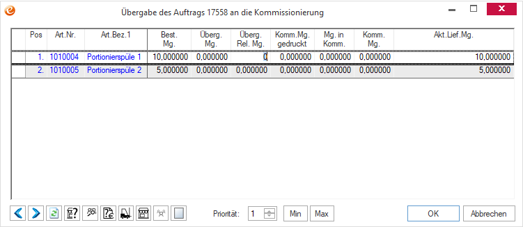 Nach der Eingabe der Menge 10 in die Spalte "Überg. rel. Mg" werden diese Seriennummern durch das Klicken auf "OK" automatisch direkt an die Kommissionierung übergeben.