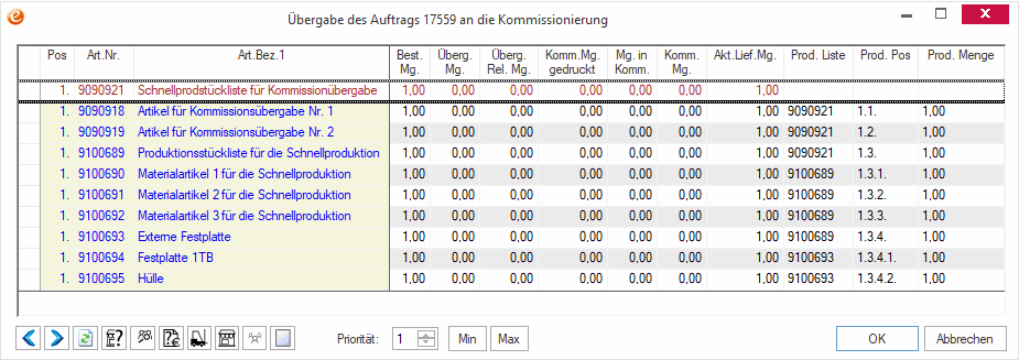 Wird ein Artikel, der zur Schnellproduktion in der Kommissionierung gekennzeichnet ist, in einem Auftrag erfasst, so wird bei der Kommissionsübergabe die Produktionsstückliste aufgelöst dargestellt. Der im Auftrag erfasste Schnellproduktionsartikel wird dabei braun markiert. Die Produktionsstücklistenpositionen erkennt man zum einen daran, dass diese die gleiche Positionsnummer tragen und zum anderen an den drei zusätzlich sichtbaren Spalten: Produktionsliste, Produktionsposition, Produktionsmenge.