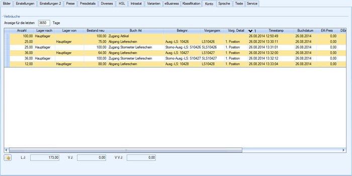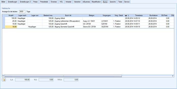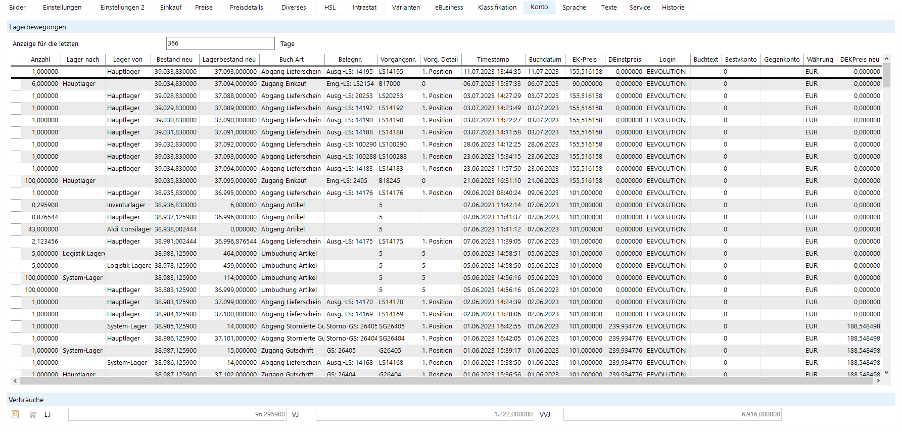 Mit der Registerkarte 'Konto' ist es möglich, die Artikelbewegungen zu verfolgen. Die Anzeige der Artikelbewegungen auf diesem Reiter kann auf einen bestimmten Zeitbereich (= wie viele Tage in die Vergangenheit) eingeschränkt werden. Diese Einschränkung findet in dem Eingabefeld unter "Anzeige für die letzten ... Tage" statt. Dort kann angegeben werden, auf wie viele Tage in die Vergangenheit die Anzeige eingeschränkt werden soll. Für jeden Benutzer wird seine zuletzt getroffene Einschränkung automatisch gespeichert und beim nächsten Aufruf selbstständig geladen. Standardmäßig werden 365 Tage angezeigt, diese Einschränkung wird jedoch immer durch die benutzerspezifischen Einschränkungen überschrieben.