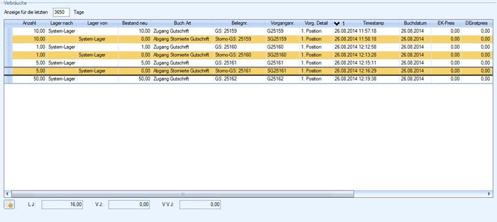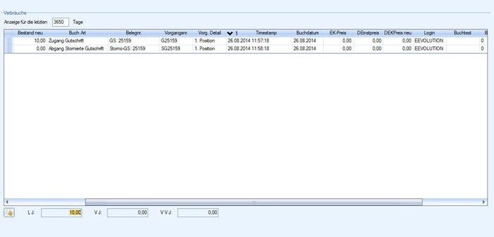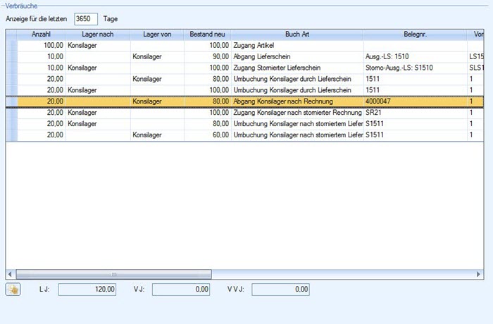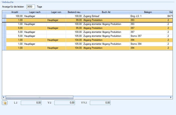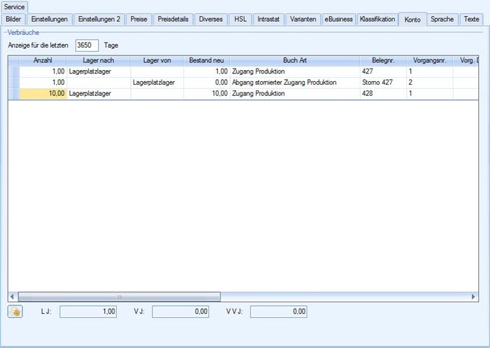 In den drei Datenfelder LJ, VJ und VVJ werden alle Verbräuche eines Artikels des laufenden Jahres (LJ), des Vorjahres (VJ) und des Vorvorjahres (VVJ) kumuliert angezeigt.
