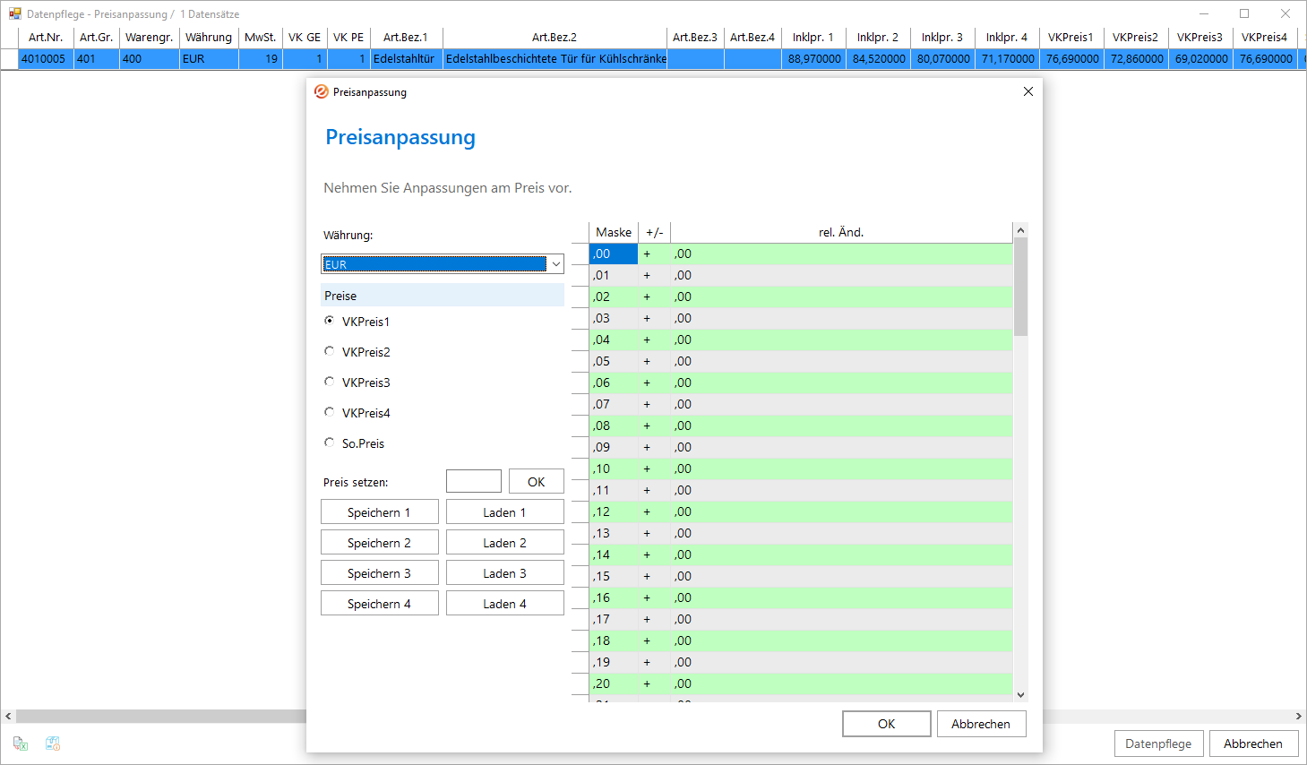 In der Feldgruppe Preise wird ganz oben angegeben, ob die Nachkomma- oder Vorkommastellen bearbeitet werden sollen. Die Preisbeträge der Datensätze, die den in der Tabellenspalte Maske angezeigten Werten entsprechen, werden um den in der Tabellenspalte rel. Änd. eingetragenen Wert erhöht bzw. bei Setzen des Vorzeichens in der Tabellenspalte +/- auf - erniedrigt.