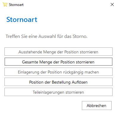 Dieser Menüpunkt wird im Dialogfenster "Stornoart" deaktiviert, wenn noch keine Einlagerungen zur markierten Bestellung vorgenommen worden sind.