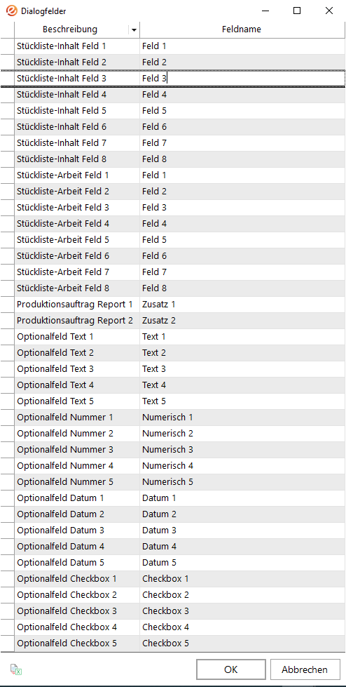 Klicken Sie im Applikationsmenü auf Verwaltung -> Produktion -> Feldbezeichnungen. Die Systemtabelle Dialogfelder erscheint.