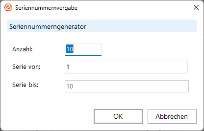 Das Feld "Serie bis" wird automatisch befüllt mit der letzten automatisch generierten Seriennummern befüllt.